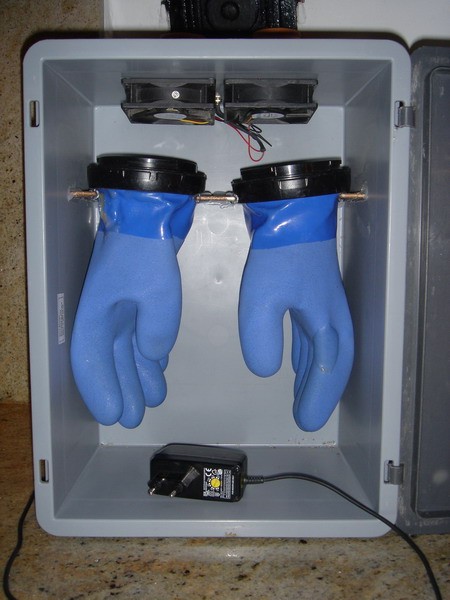 Habe aus alte PC’s die Prozessorenlüfter ausgebaut und als Handschuhtrockner missbraucht. Da ich eh alles Material in entsprechende Utz Boxen verstaue, war es nahe liegend die Lüfter gleich in die Box einzubauen. Eine Cinch-Büchse in der Aussenwand dient als Anschluss für ein einfaches Universal-Netzgerät. Die Lüfter haben 12 Volt, liessen sich also auch ab Autobatterie oder Tauchlampenakku betreiben. Etwas dünnes Sperrholz, Karton oder Plexi entsprechend passend zur Box und Handschuhringe ausschneiden, Heissklebepistole und fertig ist das Ganze. Eine Nacht lang laufen lassen und das Kondenswasser ist weg. Die Handschuhe miefen auch nicht mehr so grässlich.