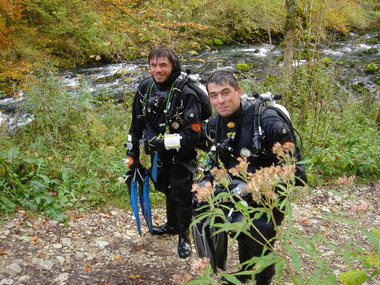 | Swiss Cave Diving Instruktoren sind aktiv: schon wieder ein Kurs erfolgreich beendet! Unser neuer Cavern Instructor Patrick Houtsch aus Luxemburg konnte am letzten Wochenende erfolgreich seinen ersten eigenen HT1 Kurs für Swiss Cave Diving im französische Jura abschliessen. Getaucht wurde an diesem WE an der Source de l'Ain bei Conte (Samstag) und an der Gouron (bei Lods). Während die Sichtverhältnisse an der Source de l'Ain ganz passabel waren (3-5m), konnte man zwar an der Gouron dasselbe zuerst auch meinen, mindestens wenn man in den Fluss, die Loue, hinunterschaute. Die Regenfälle der vergangenen Tage hatten aber massiv Laub und Sedimente in die Höhle hineingetragen, so dass nach wenigen metern praktisch Nullsicht herrschte und zur Umkehr zwang. Für die Kursteilnehmer trotzdem eine wertvolle Erfahrung..... |